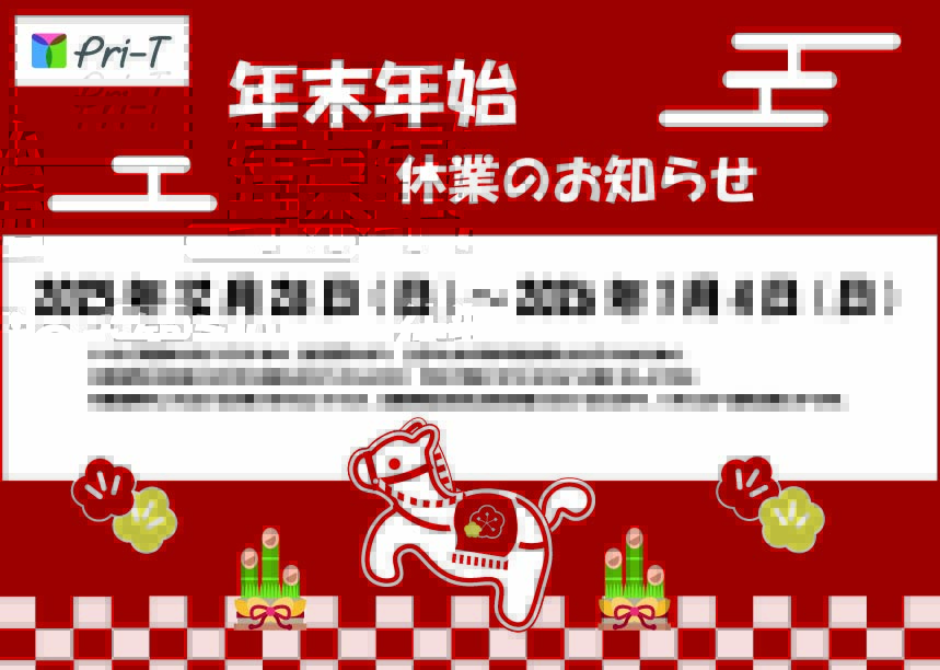 今年一年、Pri-Tをご利用いただきまして誠にありがとうございました。 お客様にはご迷惑をお掛け致しますが、下記期間を年末年始休暇とさせていただきます。 2 … - オリジナル印刷・注文の流れ