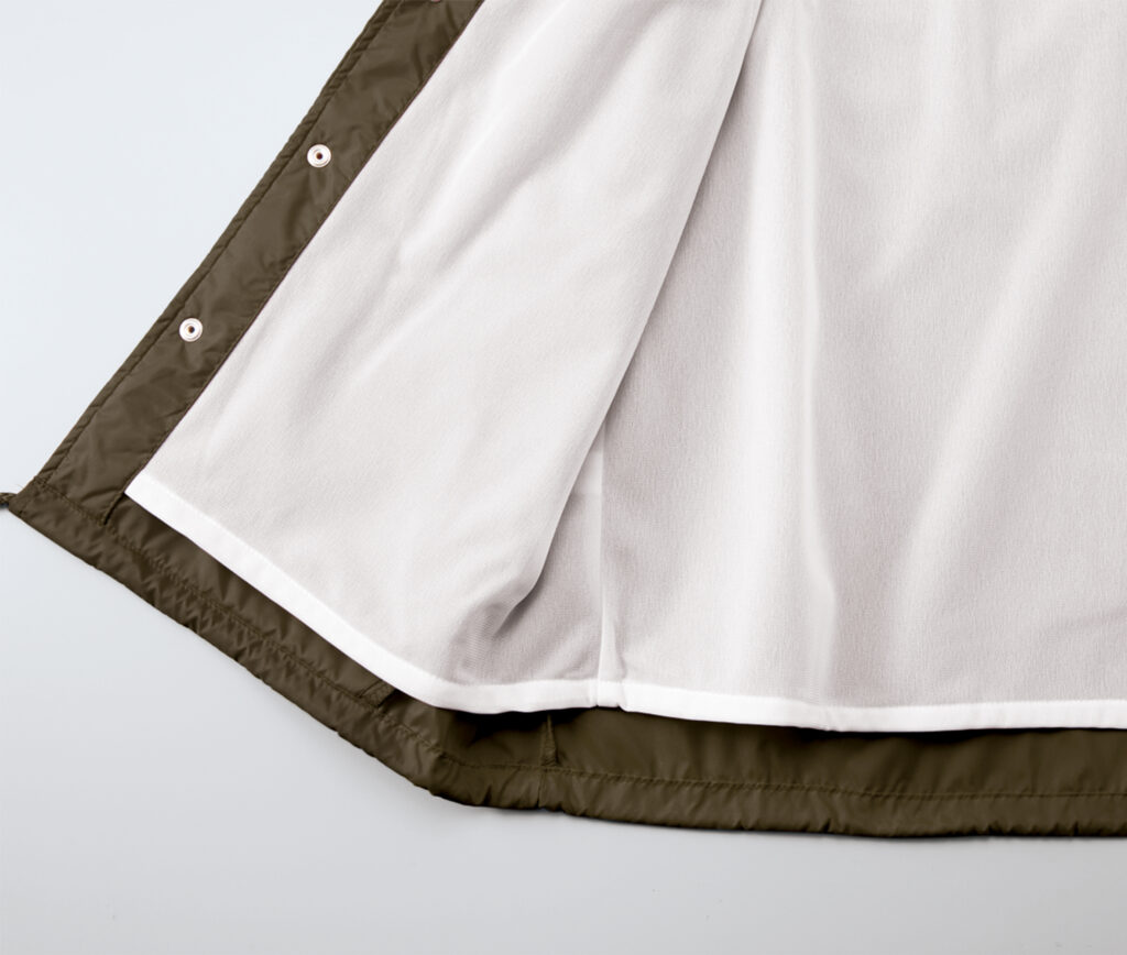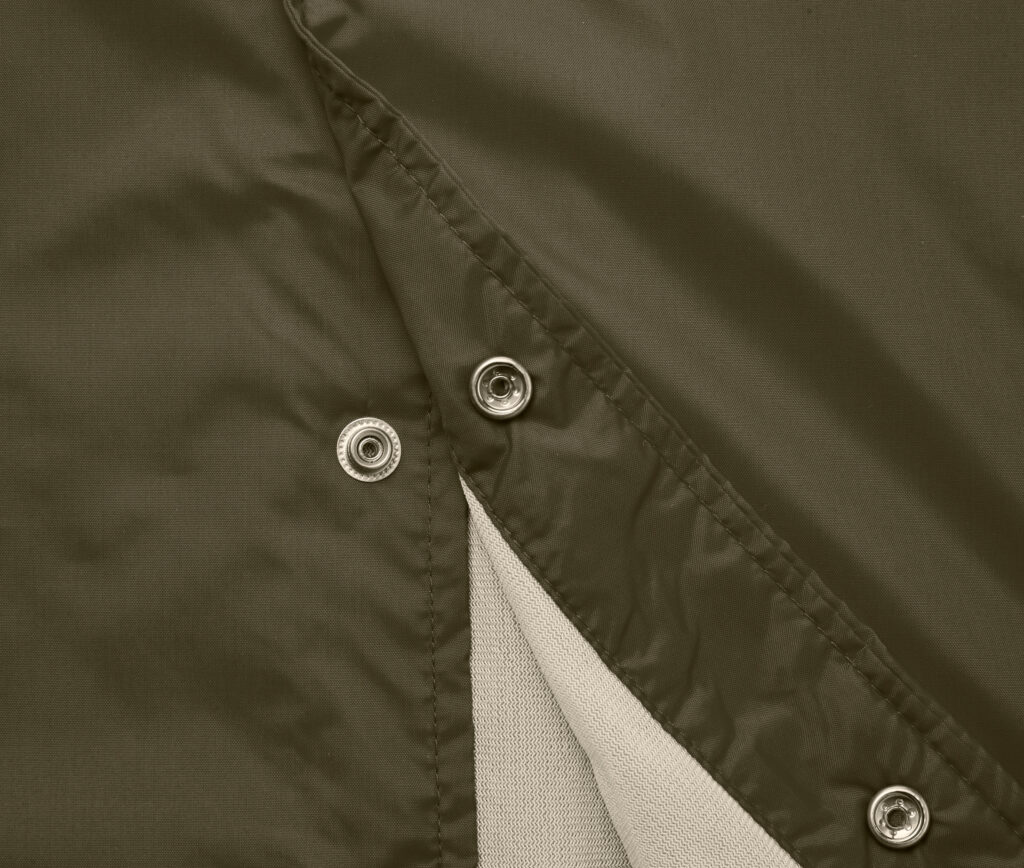 ウェザーのマットな生地で仕上げ、L.A.ワーカーのスタイルを体現したコーチジャケット。フロントとポケット口には金属製のアメリカンなドットボタンを使用し、細部にまでこだわっています。