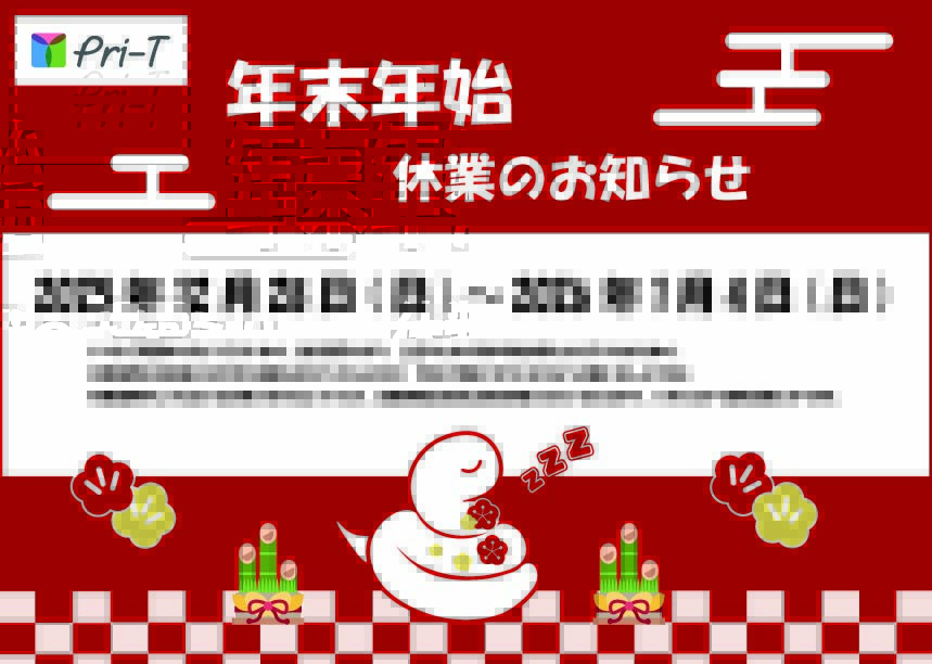 今年一年、Pri-Tをご利用いただきまして誠にありがとうございました。 お客様にはご迷惑をお掛け致しますが、下記期間を年末年始休暇とさせていただきます。 2 … - オリジナル印刷・注文の流れ